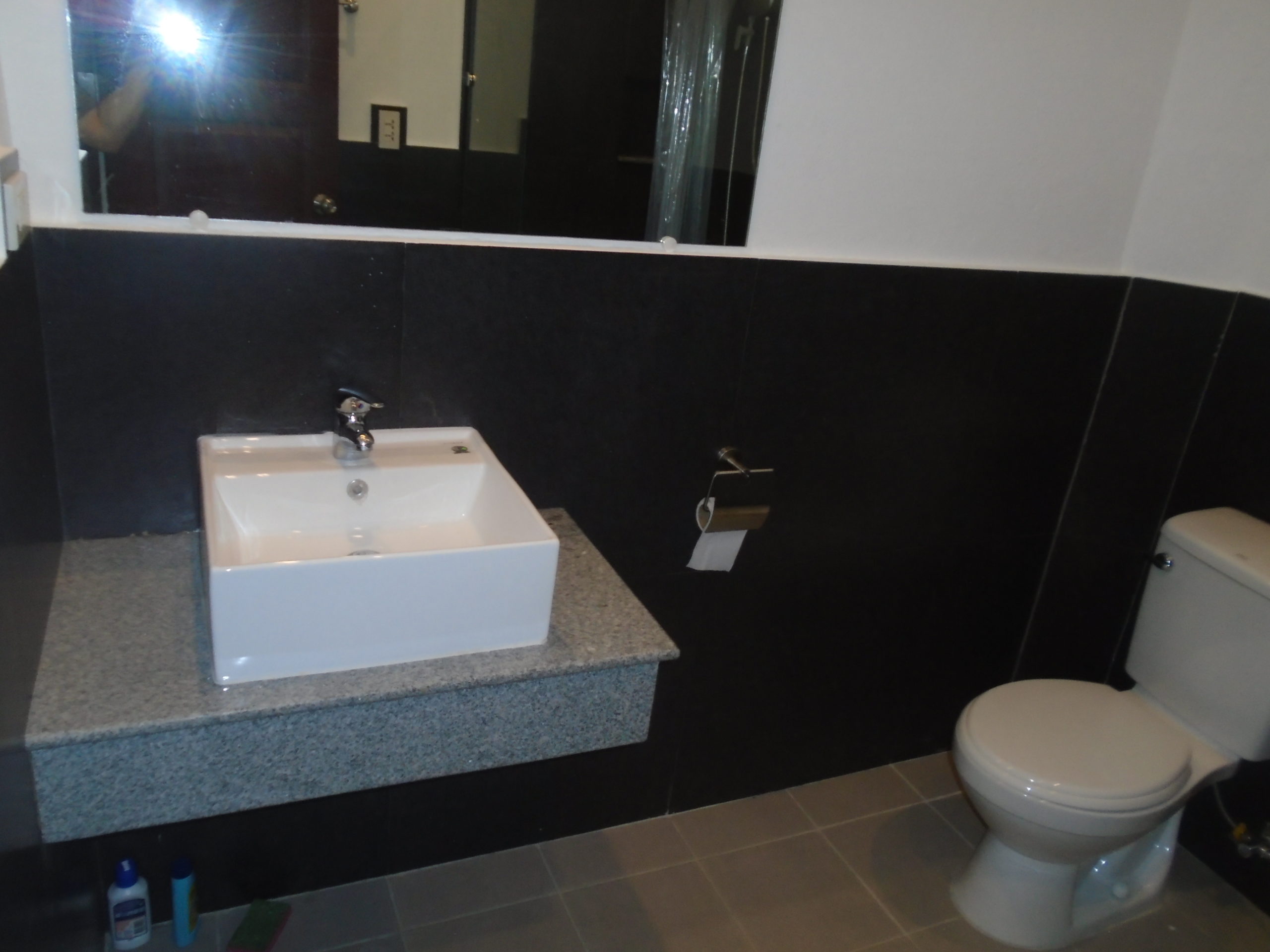 - Private bathroom with shower, sink, granite countertop and hot water