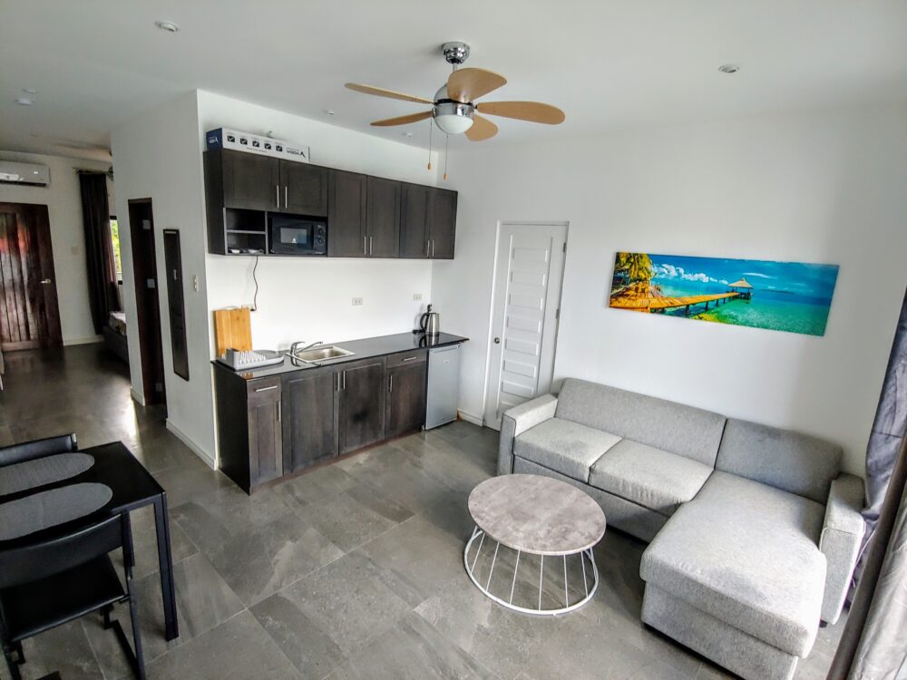 This upstairs 1 Bedroom Apartment comes with a king-size bed and a sleeper sofa. Designed in German quality, open-concept living area, they have private bathroom and complete kitchen with fridge.