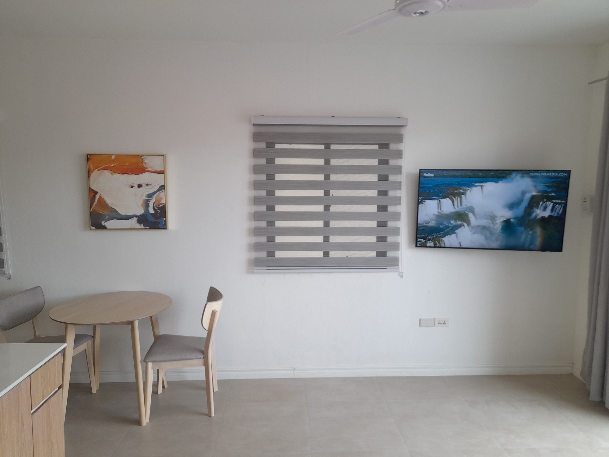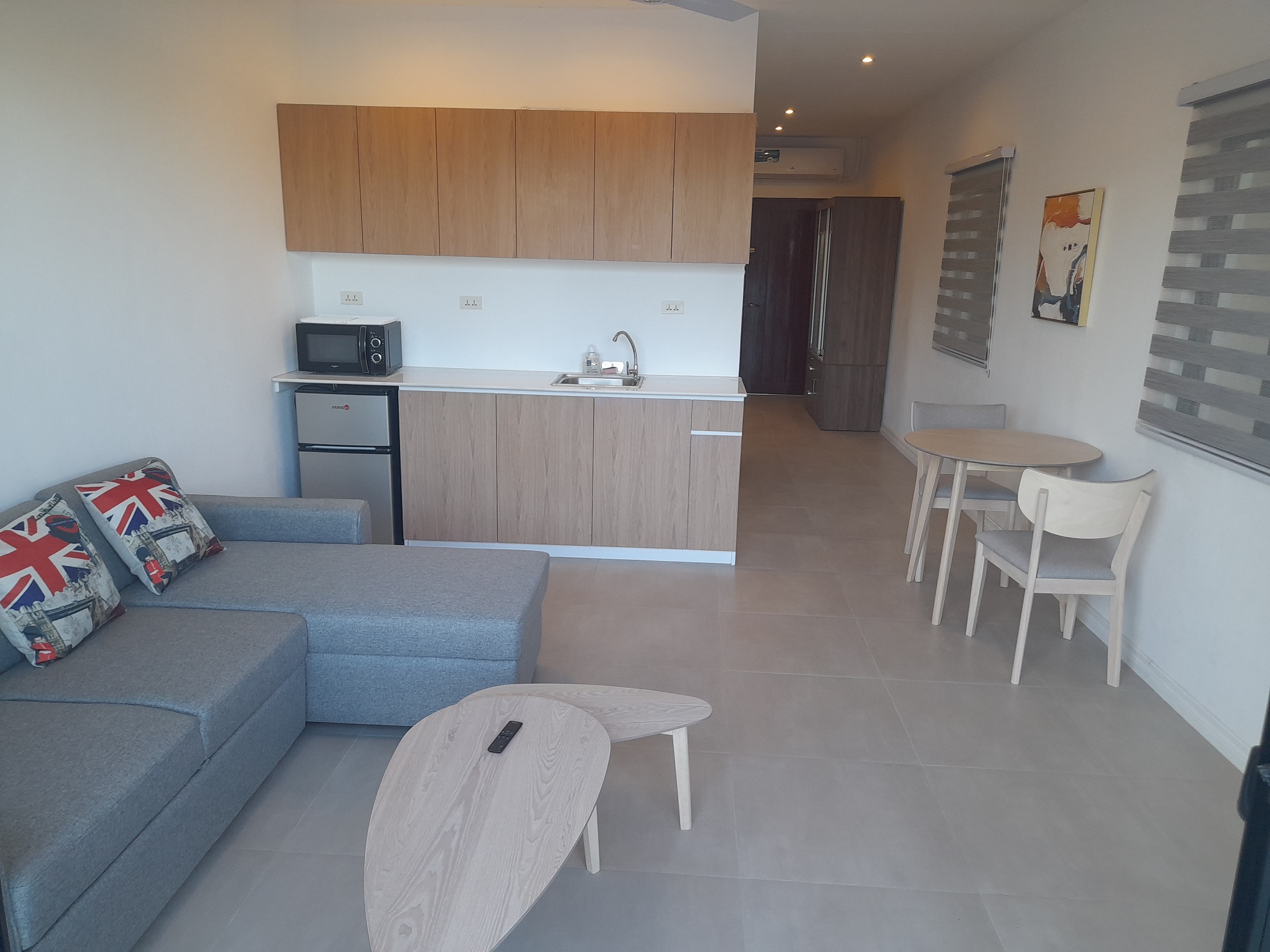The apartment size is 38 square meters plus 6 square meter private balcony. They are also equipped with a refrigerator, air-conditioning unit, table and chairs, hot and cold water, wardrobe, large Samsung smart TV and kitchen appliances.